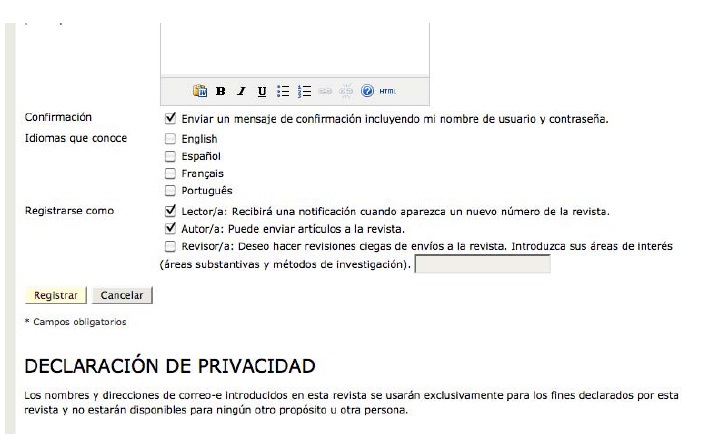 I. Los autores que deseen proponer sus trabajos a dictaminación, deberán registrarse en la dirección electrónica http://www.journals.unam.mx/index.php/crs/user/register llenando el formato con sus datos y marcando las casillas de "lector" y "autor", como se muestra en la imagen siguiente de la parte inferior del formato: