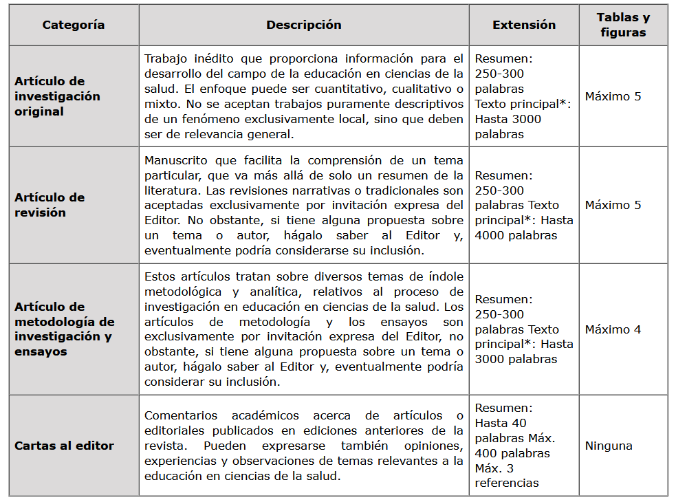 La revista Investigación en Educación Médica es una publicación periódica mexicana, con arbitraje por pares, que publica reportes de investigación original, así como artículos de revisión y perspectivas de alta calidad, del área de la educación en ciencias de la salud. Investigación en Educación Médica está dirigida a instituciones, académicos, profesionales y estudiantes en el campo de la medicina y ciencias de la salud interesados en los aspectos teóricos y prácticos de la educación en este campo. Los artículos publicados se enfocan en cualquier nivel educativo, desde el pregrado, el posgrado y hasta el desarrollo profesional continuo, con el fin de analizar experiencias y estimular el establecimiento de corrientes innovadoras de pensamiento en el campo de la educación en ciencias de la salud. Esta revista es de acceso abierto; todos los artículos están disponibles de forma inmediata y permanente para facilitar su lectura y su descarga según la licencia de uso Creative Commons CC BY-NC-ND (https://creativecommons.org/licenses/by-nc-nd/4.0/). Categorías de manuscritos Investigación en Educación Médica publica artículos de investigación original, de revisión, de metodología de investigación en ciencias de la salud, editoriales, ensayos críticos y cartas al editor. Las guías específicas para cada categoría se describen en la siguiente tabla: