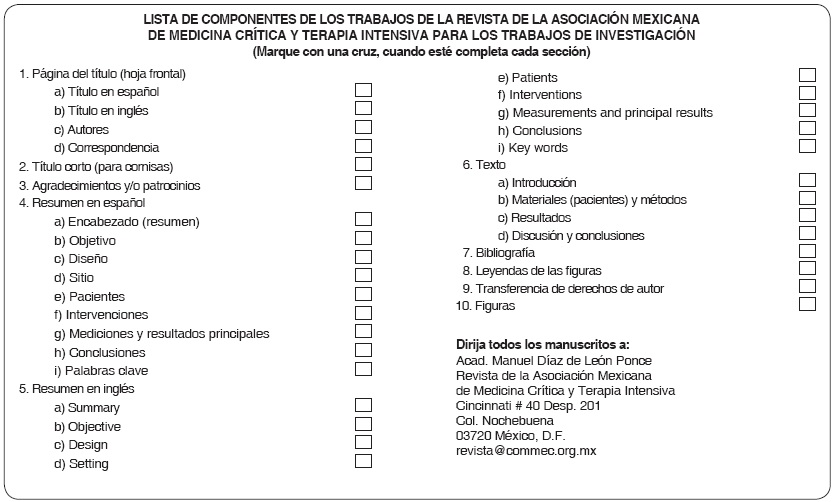 La Revista de la Asociación Mexicana de Medicina Crítica y Terapia Intensiva (Rev Asoc Mex Med Crit y Ter Int) publica artículos de investigación, de revisión, casos clínicos y cartas relacionadas con la Medicina Crítica en México y en el extranjero. Los manuscritos deben de prepararse de acuerdo con los Requerimientos Uniformes para el Envío de Manuscritos a Revistas Biomédicas (Formato Vancouver) desarrollados por el Comité Internacional de Editores de Revistas Médicas (ICMJE) que ha sido aceptado por más de 500 editores. La versión actualizada se encuentra disponible en: www.ICMJE.org. El envío del manuscrito implica que éste es un trabajo que no ha sido publicado (excepto en forma de resumen) y que no será enviado simultáneamente a otra revista. Los manuscritos enviados serán propiedad del Colegio Mexicano de Medicina Crítica, A.C. y no podrán ser publicados (parcial o totalmente) en ninguna otra parte sin el consentimiento del Editor. Los manuscritos originales no serán devueltos, por lo que se recomienda a los autores conservar una copia completa del artículo original. Todos los manuscritos deberán de enviarse en versión electrónica y las figuras que formen parte del mismo a la siguiente dirección electrónica: revista@commec.org.mx; es indispensable que se anote el nombre de los archivos para poder localizarlos. Además, el manuscrito y las figuras deberán incluirse en archivos independientes. Se sugiere escribir en Arial a 12 puntos. Los conceptos vertidos en los trabajos son de la exclusiva responsabilidad de los autores, y no reflejan necesariamente el punto de vista de los editores de la revista. PRESENTACIÓN GENERAL Todos los artículos se escribirán en español, según las normas de la Real Academia de la Lengua, con términos científicos y técnicos de aceptación general, uso común y base gramatical correcta. Se recomienda enviar los trabajos a doble espacio en todo su contenido, en un solo lado de las hojas de papel grueso, blanco, de buena calidad, de 28 x 21.5 cm (tamaño carta) y márgenes de 2.5 cm. Es necesario enfatizar la importancia de efectuar la redacción del manuscrito a doble espacio que deberá ser mantenida en todas y cada una de las diferentes secciones del trabajo, para facilitar la edición del artículo. Todas las páginas del trabajo se numerarán en forma consecutiva y esto incluye la página inicial. Se anotará en la parte superior de cada página el número progresivo y el apellido del primer autor del trabajo. Además, deberán enviarse en forma electrónica el manuscrito y las figuras que forman parte del mismo. Cuando se utilicen abreviaturas no convencionales, debe indicarse entre paréntesis la abreviatura, cuando el término completo que se desea abreviar, aparezca por primera vez. Salvo en casos excepcionales, la extensión del artículo no será mayor a 12 cuartillas (sin incluir la bibliografía). COMPONENTES DEL ESCRITO MÉDICO. La Revista de la Asociación Mexicana de Medicina Crítica y Terapia Intensiva recomienda a los autores que envíen trabajos para publicarse e incluyan los siguientes capítulos: