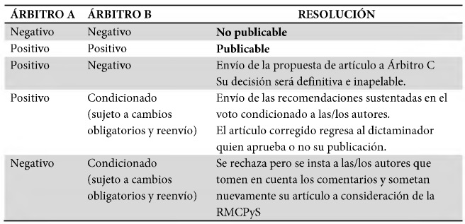 - Si el trabajo recibió un dictamen negativo y uno condicionado, el artículo es rechazado, pero se insta a los autores que tomen en cuenta los comentarios y sometan nuevamente su artículo a consideración de la RMCPS.