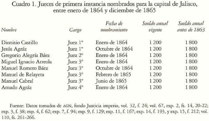 En lo que se refiere a los salarios de los jueces foráneos letrados, serían iguales a los que percibían los jueces de la capital, y los legos tendrían asignada la mitad del sueldo. En el segundo caso, serían asistidos por un juez letrado cercano, quien percibiría la otra mitad del salario correspondiente. Así, por ejemplo, el alcalde de Atotonilco, Miguel Jaramillo, durante el mes de septiembre de 1864 se hizo cargo del juzgado de letras de ese distrito judicial, pero por no ser letrado, cobraba 600 pesos de salario; mientras que el juez letrado de La Barca, Francisco Gómez Rubalcaba, percibió en ese mismo mes un sobresueldo de 600 pesos por asesorar al juez de Atotonilco.40