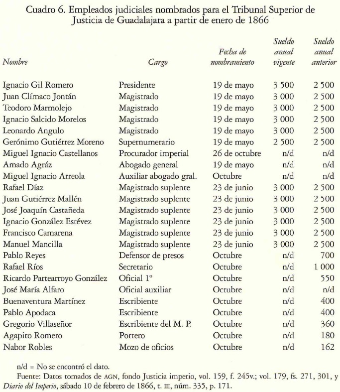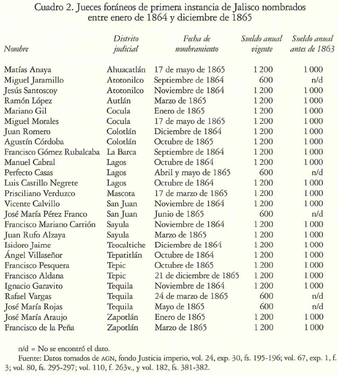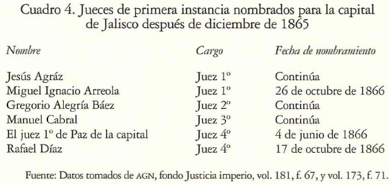 77 "Lista de las personas que desempeñan actualmente los empleos del orden judicial, en que se comprenden algunos juzgados de primera instancia que aunque situados en otros departamentos, están sujetos por ahora al Tribunal Superior de Justicia de Jalisco", 8 de octubre de 1866, en ibid., vol. 159, f. 245v.