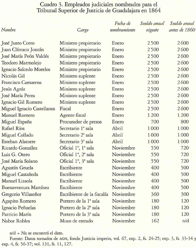 La jurisdicción del Tribunal Superior de Justicia de Guadalajara comprendería los departamentos de Jalisco, Sonora, Sinaloa y territorios de Californias y Colima. Estaría integrado, de acuerdo con el presupuesto de sueldos y gastos del ramo judicial remitido el 13 de agosto de 1864, por cinco ministros (distribuidos en tres salas, una colegiada y dos unitarias), un fiscal, un agente fiscal, tres secretarios, un abogado de pobres y defensor de reos, tres oficiales, cuatro escribientes, un escribiente ministro ejecutor y tres porteros.48 En el cuadro 3 se muestra a los empleados judiciales nombrados para esos puestos entre enero y noviembre de 1864.
