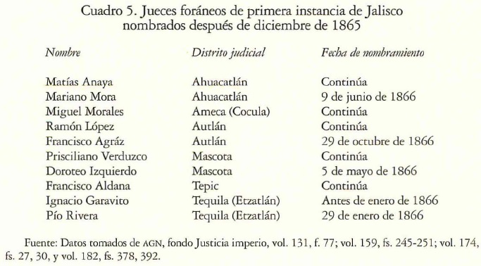 De hecho, en el departamento de Jalisco todos los jueces de primera instancia de la capital y foráneos (excepto el de Mascota y el de Tequila) que habían sido nombrados en el periodo anterior, conservaron su cargo, incluyendo los juzgados de los distritos de Tepic y Ahuacatlán, que de acuerdo con la ley de división territorial de marzo de 1865 conformarían el departamento de Nayarit,68 como se puede apreciar en los cuadros 4 y 5.