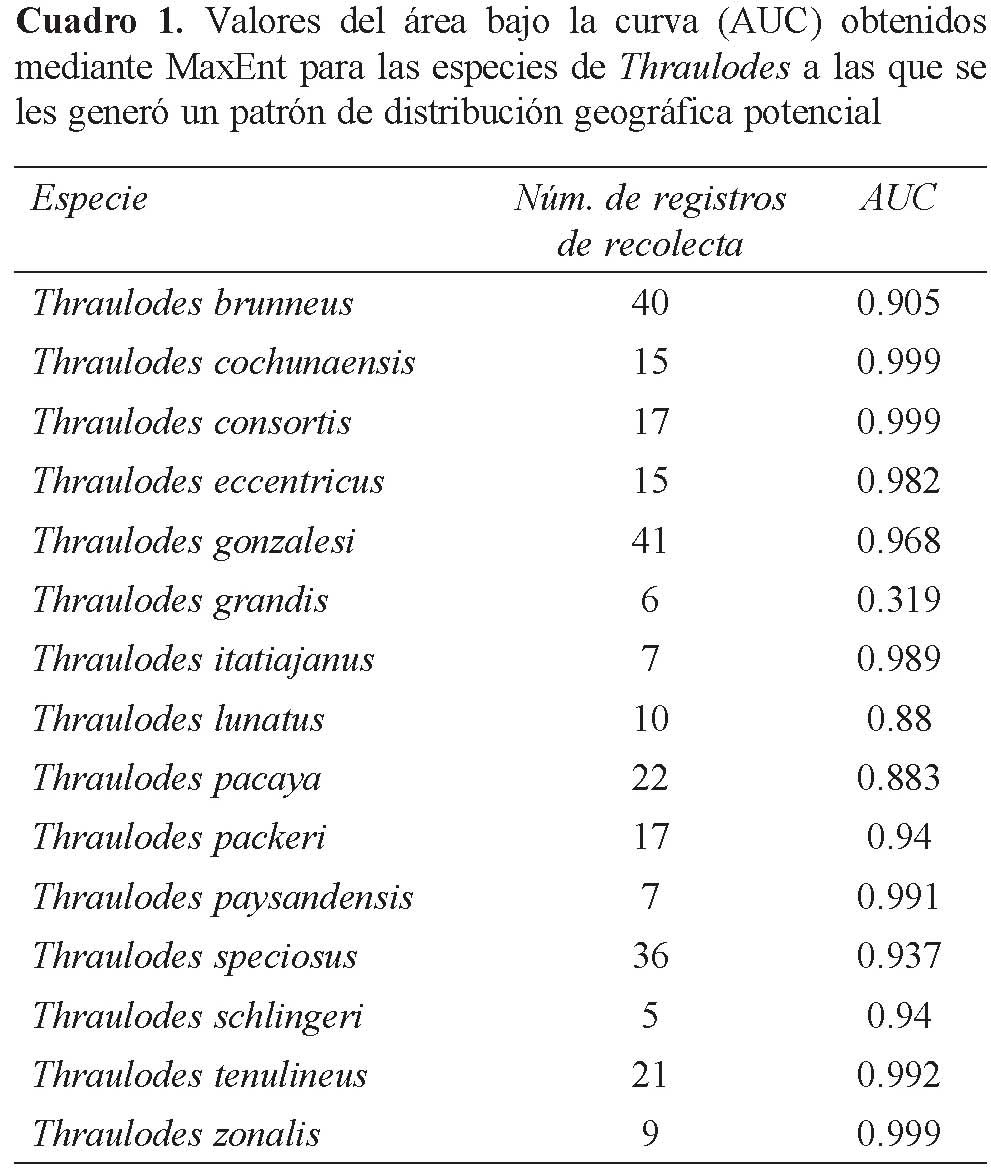 Modelado de la distribución geográfica potencial. Con las localidades georreferenciadas se generaron las potenciales áreas de distribución geográfica en el continente Americano, para las especies de Thraulodes que contaban con al menos 5 registros de localidades de colecta. Este valor mínimo de registros se sustentó en los resultados arrojados por el estudio de Hernández et al. (2006). El programa empleado fue MaxEnt o algoritmo de máxima entropía (Phillips et al., 2004), el cual estima la probabilidad de presencia de una especie buscando la distribución de máxima entropía (la más uniforme posible) en función de variables ambientales tanto cuantitativas como cualitativas (Phillips et al., 2006; Phillips y Dudík, 2008; Illoldi-Rangel y Escalante, 2008).