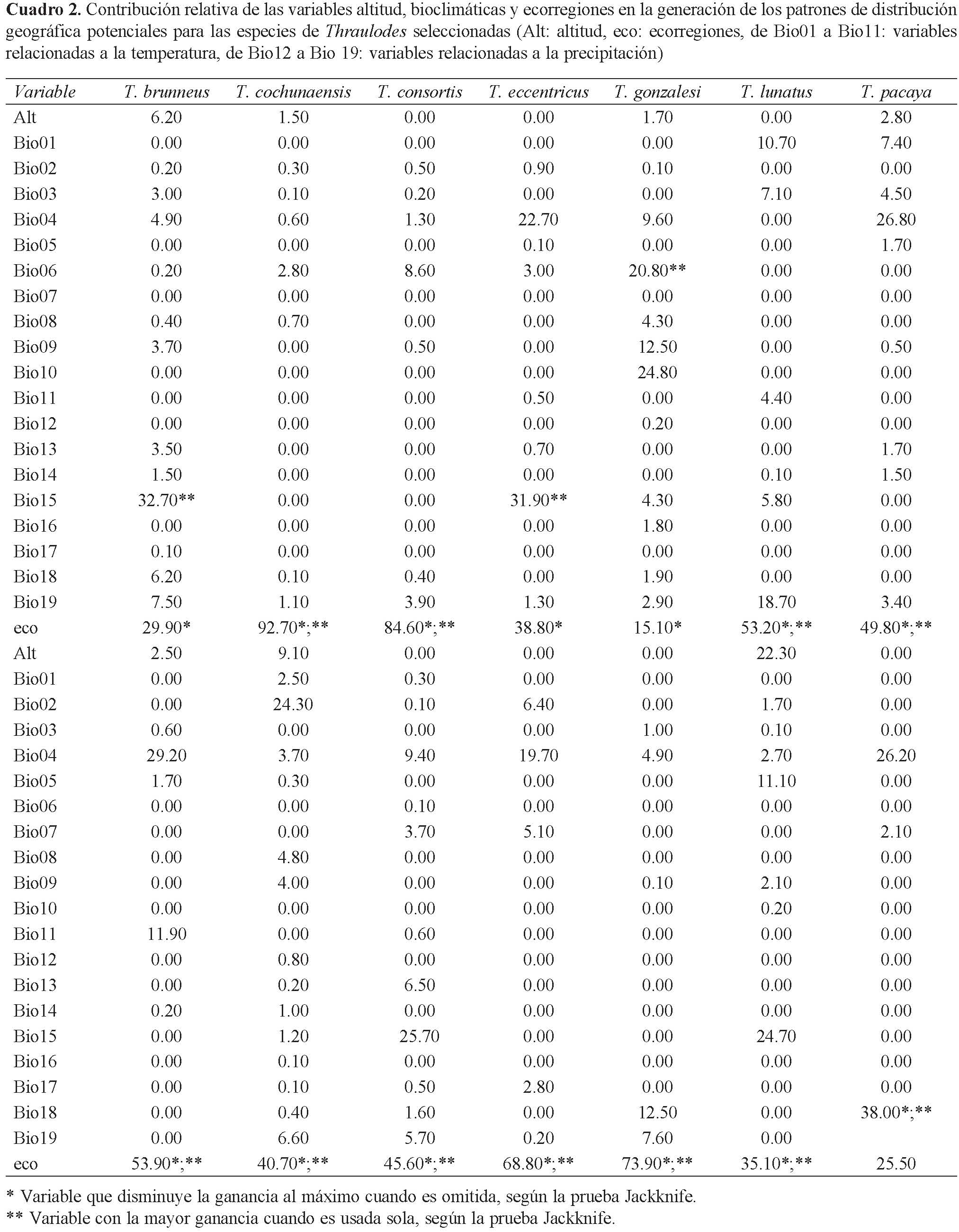 Algunas variables bioclimáticas presentaron valores altos para determinadas especies (Cuadro 2), no obstante la prueba de Jackknife mostró que estas no tenían efecto alguno sobre sus distribuciones geográficas. Tal fue el caso de la altitud, Bio04 (estacionalidad de la temperatura), Bio15 (estacionalidad de la precipitación), entre otras.