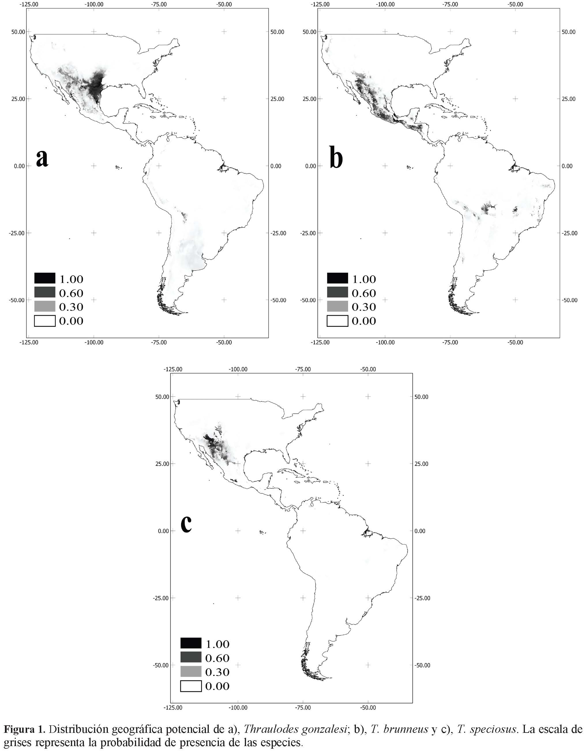 Thraulodes es uno de los géneros más diverso a nivel mundial (Barber-James et al., 2008), más abundante en el continente americano (Domínguez, 1987), con una distribución estrictamente panamericana (Traver y Edmund, 1967; Allen y Brusca, 1978; Domínguez, 1987; Allen, 1992; McCafferty, 1998) y de origen suramericano austral (Allen y Murvosh, 1983; McCafferty, 1998), el cual adicionalmente cuenta con registros de recolecta desde limitados (Sudamérica) hasta amplios (Centro y Norteamérica) para sus especies. En este orden de ideas, el género contiene especies cuyos registros se restringen exclusivamente a Norteamérica y/o a Sudamérica. Sólo Norteamérica y Centroamérica comparten especies, mientras que esta última y Sudamérica no lo hacen (McCafferty, 1998), aun cuando ambas regiones pertenecen al Neotrópico (Morrone, 2004). McCafferty (1998) apuntó que la formación del istmo de Panamá generó una vía de dispersión que favoreció el movimiento de un mayor número de especies de efemerópteros de origen austral, en dirección sur-norte, mientras que factores bióticos, paleoecológicos y paleogeográficos limitaron la dispersión en dirección norte -sur. En tal sentido, se esperaría que las distribuciones potenciales de las especies neotropicales del género Thraulodes abarquen tanto el Neotrópico suramericano (Sudamérica) como el Neotrópico mesoamericano (Centroamérica), mientras que las especies restringidas al Neártico (Norteamérica), deberían evidenciar distribuciones muy limitadas.