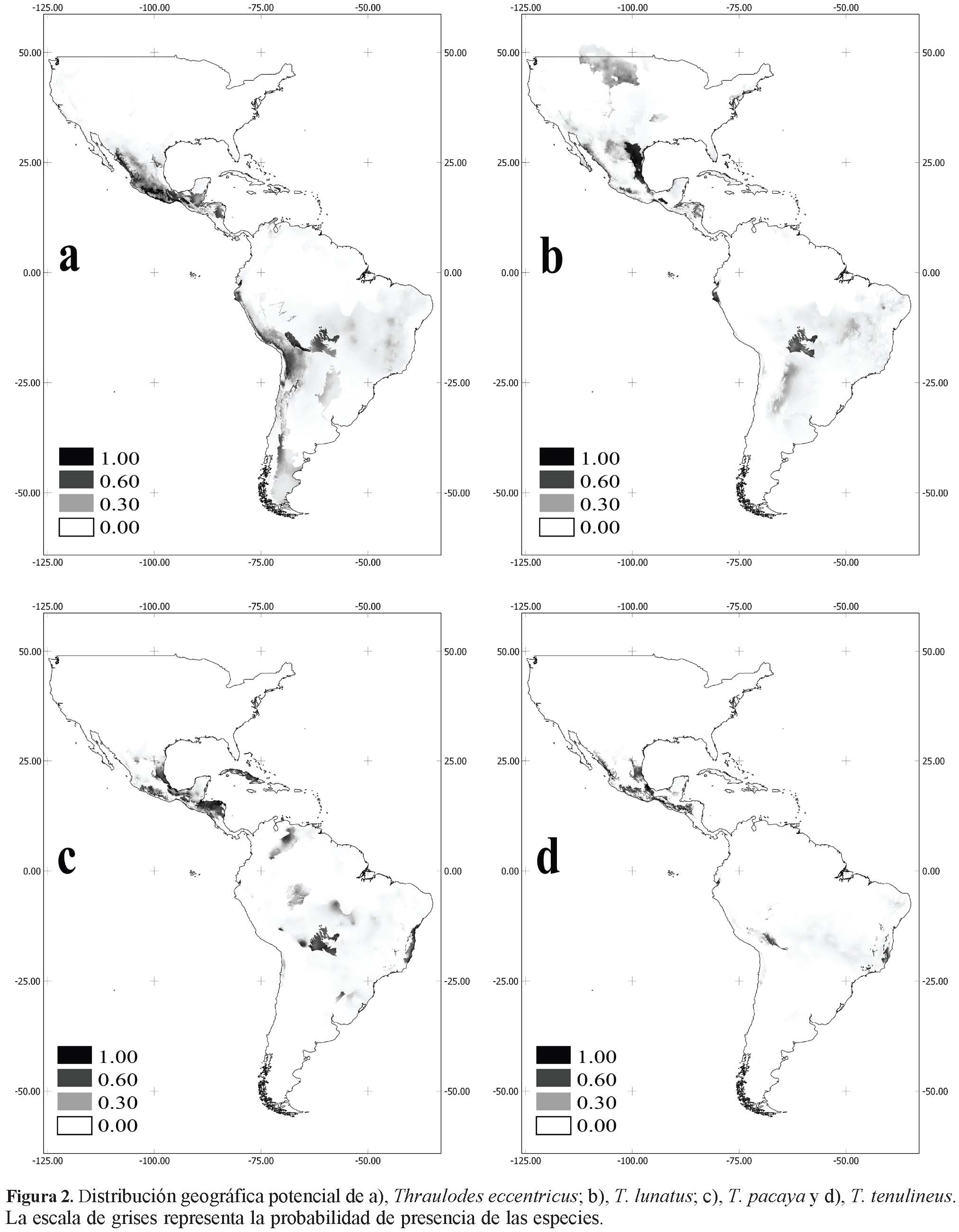 Las especies T. eccentricus, T. lunatus, T. pacaya y T. tenulineus muestran muy poca penetración en el Neártico y parecen distribuirse entre la ZTM y el dominio Mesoamericano de la subregión Caribeña del Neotrópico (Figs. 2a-d). Todas estas especies muestran distribuciones potenciales en la subregión Amazónica, no obstante la de T. tenulineus parece ser muy restringida y la de T. eccentricus parece abarcar la ZTS.