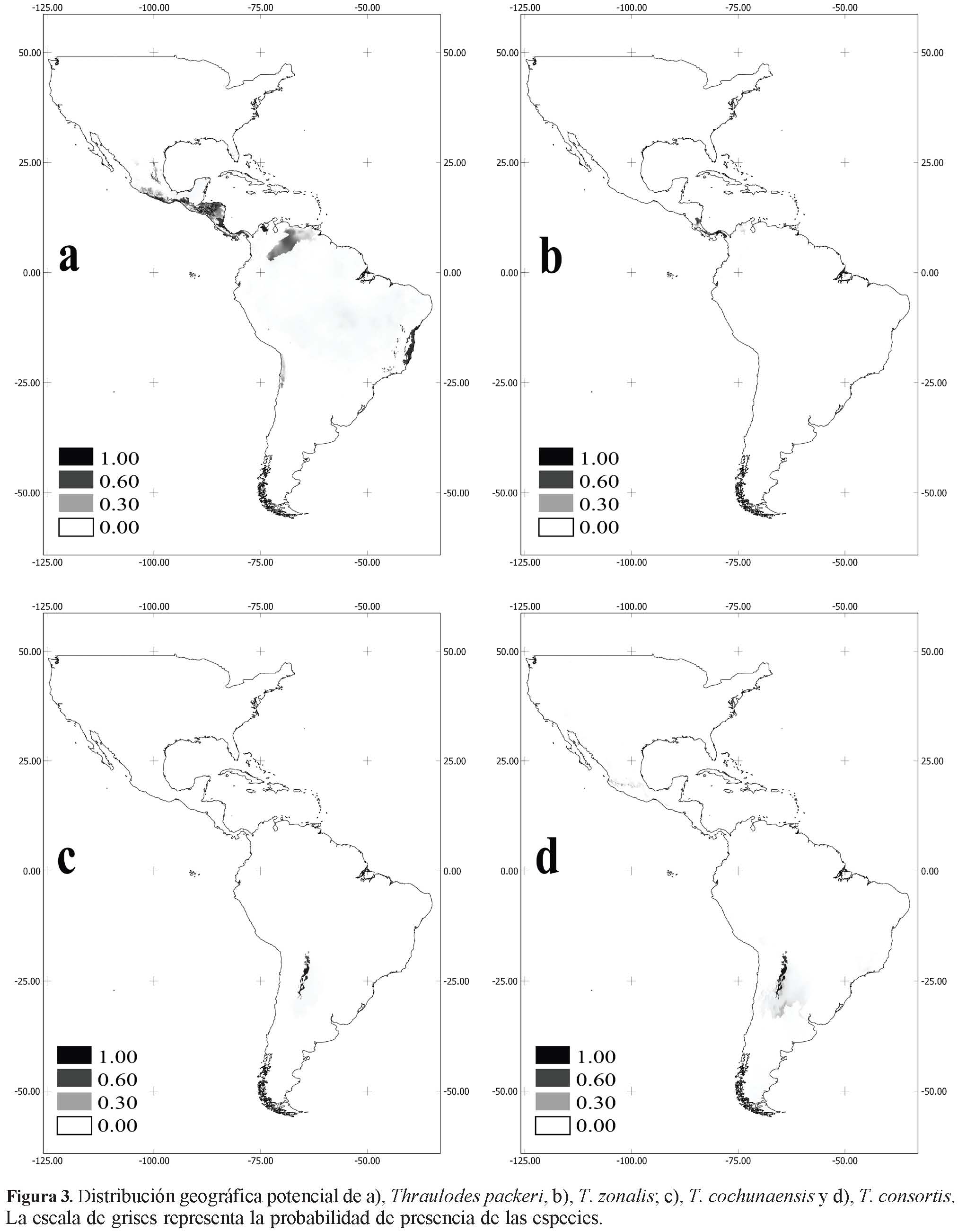 T. packeri y T. zonalis (Figs. 3a, b) presentan una distribución netamente Neotropical, específicamente en el dominio Mesoamericano de la subregión Caribeña. La primera muestra distribuciones potenciales en el dominio del noreste suramericano de la región Neotropical y en los bosques atlánticos brasileños de la subregión Amazónica. En tanto que, la segunda parece restringirse exclusivamente al dominio Mesoamericano de la subregión Caribeña del Neotrópico, tal como expusieron Allen y Brusca (1978); sin embargo, mostró una potencial presencia en las costa atlántica del dominio Antillano Neotropical (península de Yucatán).