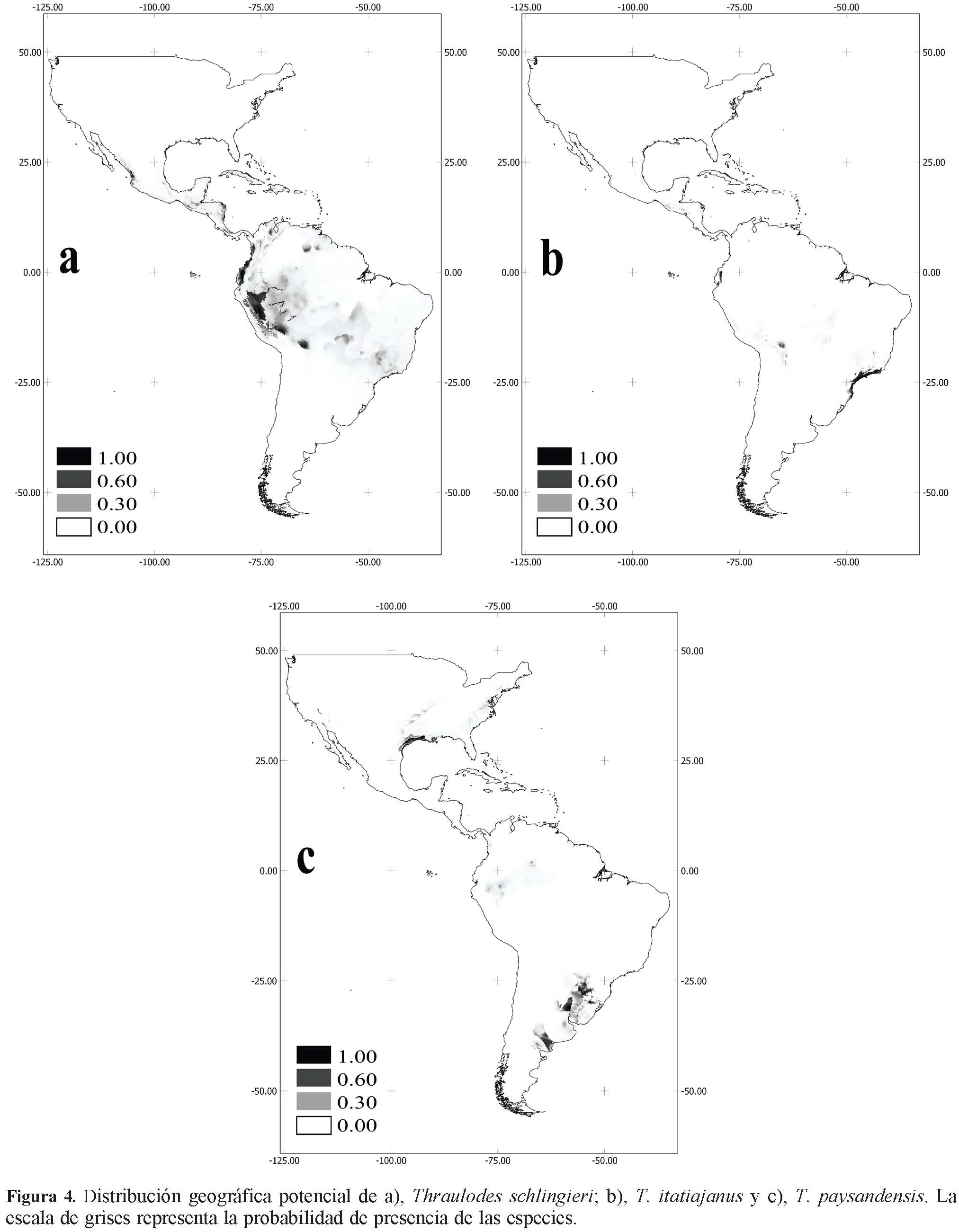 Las restantes especies están restringidas al Neotrópico suramericano. En tal sentido, T. cochunaensis y T. consortis se restringen exclusivamente a la subregión Amazónica y al pie de monte de la ZTS (Figs. 3c, d); T. schlingeri se distribuye en la subregión Amazónica, cercana al piedemonte andino, caracterizadas por las yungas y también muestra distribuciones potenciales en la ZTS y en la costa pacífica de la subregión Caribeña (Fig. 4a); T. itatiajanus está restringida al bosque atlántico de la subregión Paranaense (Fig. 4b) y presenta una distribución potencial en la provincia del Cauca del dominio del noreste suramericano de la subregión Caribeña; por último, T. paysandensis muestra una distribución más amplia en las subregiones Caqueña y Paranaense del Neotrópico (Fig. 4c), cabe acotar que la subregión Caqueña se caracteriza por el predominio de vegetación abierta (pampas) y la Paranaense por el predominio de vegetación boscosa (Morrone, 2004).