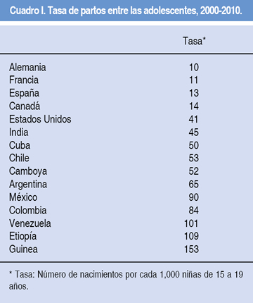 El embarazo durante la adolescencia puede calificarse como un problema de salud pública y una verdadera tragedia social. El número de nacimientos de hijos de madres adolescentes asciende a 16 millones cada año en el mundo. La tasa de partos entre adolescentes se calcula tomando en cuenta el número de nacimientos por cada mil adolescentes entre 15 y 19 años de edad. La UNICEF reporta en el Estado Mundial de la Infancia 2011 una tasa de 51, con un notable contraste entre los países desarrollados (23) y los subdesarrollados (123). En América Latina y el Caribe se tiene una tasa de 55 y en México una tasa notablemente alta de 901,4 (Cuadro I).