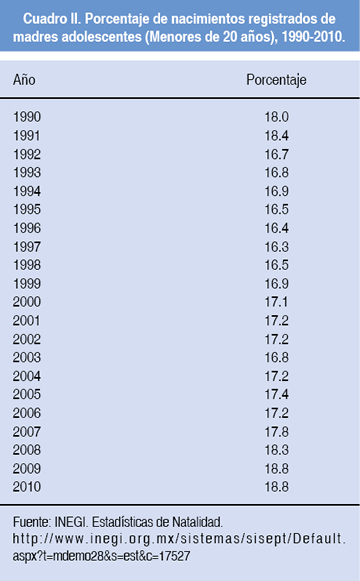 En México, el INEGI reporta que en 1990 la proporción de nacimientos registrados de madres adolescentes alcanzó 18%, y en 2010 fue de 18.8% (Cuadro II). Los estados del norte del país, como Chihuahua y Coahuila reportaron 23 y 21%, respectivamente, mientras que el Distrito Federal reportó la proporción más baja de 16.5%.