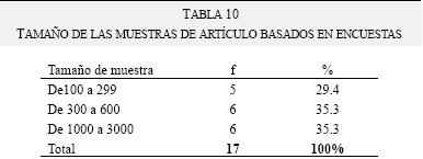 De cualquier forma, el tamaño de las muestras continúa siendo una cuestión problemática, como lo apuntaban ya en su análisis McAnany y La Pastina (1994). La tabla 10 muestra que los tamaños de las muestras reportadas para las encuestas no son tan pequeños excepto en alrededor de 30% de los estudios basados en esta técnica (menos de 300 informantes). Otro 70% de los artículos basados en esta misma estrategia cuantitativa oscilaban entre los 300 y los 3,000 informantes. Cabe señalar, sin embargo, que los únicos trabajos con 2000 informantes o más correspondían a los realizados por miembros de la Cátedra Televisa en el Tecnológico de Monterrey, Campus Monterrey (Cerda, 2002; Lozano, 2000, 2003a, Yarto y Lozano, 2004), reportando hallazgos de una muestra probabilística amplia en viviendas de Monterrey, Guadalajara, y ciudad de México sobre televisión y vida cotidiana. Otra muestra importante de 1,134 estudiantes de secundaria encuestados fue la realizada en Bogotá, Colombia, por la Universidad de la Sabana (López, 2003). Sin embargo, con excepción de los trabajos derivados de la Cátedra Televisa y algunos otros, muchas de las encuestas carecen de una discusión sobre la población y el tamaño de las muestras, los procedimientos para seleccionarlas, el diseño de investigación y otra información importante para alcanzar la calidad requerida en el trabajo de campo.