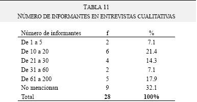 Las tablas 11 y 12 muestran el número de informantes en las entrevistas a profundidad o focalizadas así como de los grupos de discusión. En estos trabajos resulta más difícil evaluar la congruencia del tamaño de las muestras dada la flexibilidad y la variación de características y objetivos de cada uno de los estudios. Resulta problemático, sin embargo, que 32% de los trabajos basados en entrevistas de tipo cualitativo no mencionen el número real de informantes que participaron en el estudio, y que en este mismo contexto, 13 de 26 artículos basados en técnicas cualitativas no expliquen o no aclaren completamente la metodología de su trabajo de campo. La falta de esta información imposibilita la evaluación de la relevancia, validez y calidad de los resultados reportados en los estudios. Es incomprensible la razón de las revistas para aceptar 50% de estudios cualitativos que ignoran o no explican adecuadamente su metodología.