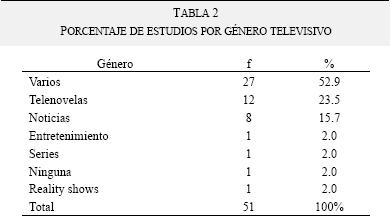 McAnany y La Pastina (1994:828849) encontraron, entre 1970 y 1993, 26 trabajos en revistas académicas, libros y tesis de posgrado que analizaban la recepción de telenovela. En la presente revisión, sólo 12 (23% de los 51 trabajos revisados, se concentraron específicamente en la revisión de este género televisivo (tabla 2). Más de la mitad de los artículos revisaban el consumo televisivo en general, algunos incluso estudiando varios géneros al mismo tiempo. Esto podría constituir una tendencia de la investigación más reciente por tomar en cuenta los distintos tipos de contenidos que consumen diferentes tipos de audiencias, algunos estudios enfocándose en el origen geográfico de los programas preferidos (De la Garza, 1997; Huerta, 2005; Huerta y Cerda, 2002; Lozano, 1994; Lozano, 2003); otros revisando la diversidad de contenidos preferidos por segmentos específicos de la audiencia como los jóvenes (Chavero y García Muñoz, 2005; González Hernández, 2006; López, 2003, 2004; Martínez, 1994; Orozco y Viveros, 1996; Renero, 1996;) e incluso otros más interesados en las mediaciones familiares en el proceso de ver televisión (Cornejo, 1992; Guadarrama, 1999; Renero, 1992, 1995 y 1997; Vega, 2005).