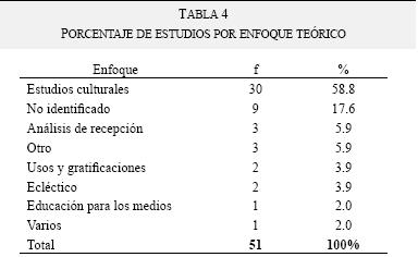 Mientras que la supremacía de lo que podemos denominar, a falta de una mejor etiqueta, estudios culturales se explica por la importancia histórica de las aproximaciones críticas en la región, nuestra revisión muestra un rango muy bajo de diversidad e interés en otras tradiciones teóricas. La perspectiva de los efectos predominante en los Estados Unidos (agenda setting, análisis del cultivo, aprendizaje social, entre otros) está completamente ausente en el corpus analizado. En América Latina, por tanto, las audiencias televisivas no parecen estudiarse desde diferentes perspectivas teóricas como ocurre en Estados Unidos o Europa occidental.