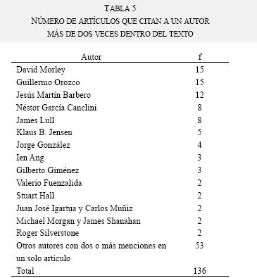 Estudios culturales es, por mucho, la perspectiva teórica que inspira la mayoría de los trabajos empíricos sobre recepción televisiva en América Latina. La tabla 4 muestra que más de la mitad de las investigaciones revisadas se basa en esta aproximación y la tabla 5 confirma esta conclusión al identificar a Morley, Orozco, Martín Barbero, García Canclini y James Lull como los autores más citados. Este hallazgo no es raro en una región como América Latina, donde los estudios críticos como la teoría de la dependencia y el imperialismo cultural primero, y los estudios culturales después, se han consolidado en las últimas décadas.