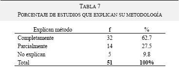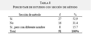 Nuestra propia revisión de 51 estudios publicados en las revistas académicas más importantes de la región muestra que en los últimos 15 años un número significativo de investigadores latinoamericanos sigue haciendo poca o nula referencia a sus metodologías (tablas 7 y 8). Alrededor de 37% de los trabajos no explica o explica de manera incompleta su metodología, y alrededor de 30% de los estudios no incluye una sección formal de método en el cuerpo del trabajo (el porcentaje sube a 46% si también se incluyen los artículos que sí explicitan su metodología pero lo hacen en alguna otra sección, como en la revisión de la literatura). Este hallazgo muestra el largo camino por recorrer en América Latina en la capacitación de investigadores de la comunicación para lograr el rigor y la exigencia deseada en el trabajo empírico. Asimismo, este resultado alerta sobre la necesidad de que los editores y evaluadores de revistas académicas sean más estrictos al dictaminar y aprobar las investigaciones puestas a su consideración para ser publicadas.