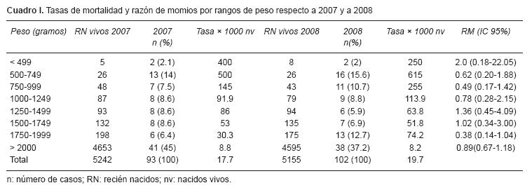 Results. The mortality rate for 2007 was 17.7 per 1000 live births, and for 2008 it was 19.7 per 1000 live births. When we compared both years, we did not find an increased risk for weight and gestational age. Malformations occupied the largest causes of death.