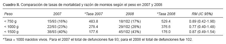 Las tasas correspondientes a los pesos < 750 g, < 1000 g y < 1500 g no arrojaron diferencias de riesgo (Cuadro II).