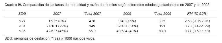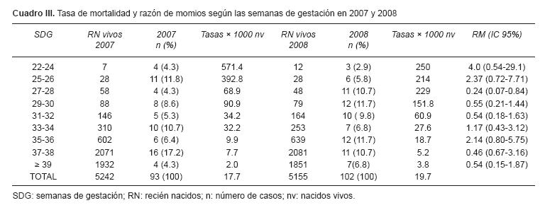 Las tasas de mortalidad por edad gestacional se presentan en el cuadro III.