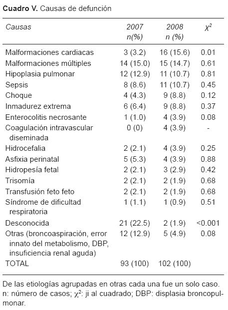 Las malformaciones ocuparon el mayor porcentaje de las causas de defunción tanto para 2007 como para 2008 con 33 y 41%, respectivamente. Las malformaciones cardiacas fueron estadísticamente significativas para el 2008 (p = 0.01). Para las demás afecciones no se encontraron diferencias (Cuadro V).
