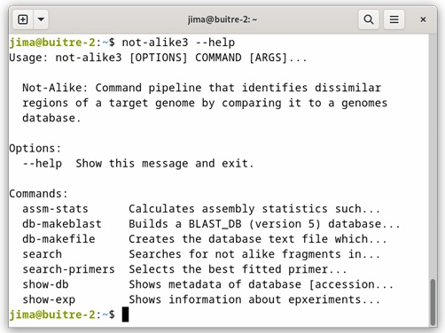 Not-alike3 is a commands pipeline written mainly in Python language (version > = 3.10) that uses several open-source free-available bioinformatics tools, described in materials and methods, and identifies unique regions of a genome of interest comparing its sequence with sequences from genome databases of related species and employs a procedure called In silico Genomic Subtractive Hybridization. Not-alike3 contains several commands namely, db-makeblast, db-makefile, search, serach-primers, show-db, show-exp and assm-stats. The db-makeblast and db-makefile commands are used to build the genomes BLAST database used in the searching procedure, the search command executes the command pipeline that identifies the unique regions, the search-primers command designs primers over the identified unique dissimilar regions. Command pipeline communication between Python and GNU/Linux Bash was implemented with functions of the Subprocess Python package. There are other miscellaneous commands, show-db, show-exp and assm-stats, the first and second commands show information about the data base and the parameters used in previous searching tasks, and the assm-stats command calculates the assembly statistics. Not-alike3 has a command line user interface built with the Click Python package that permits the user to choose the command, and pass the arguments needed (see usage information in Figure 1).