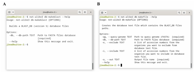 Not-alike3 is compatible with genome packages downloaded from NCBI datasets (https://www.ncbi.nlm.nih.gov/datasets/). We use datasets and dataformat NCBI command line tools to manipulate genome data packages employing the wrapping commands db-makeblast and db-makefile. This enables working with an extensive and diverse array of genomes. To build the BLAST database, Not-alike3 contains a command called db-makeblast that takes the JSON file that contains the NCBI dataset metadata. This command finds the location where FASTA files are and formats them in BLAST DB files (version 5) with makeblastdb (Camacho et al., 2009). The command db-makefile makes use of the JSON metadata file to create a text file with the paths and names of BLAST DB files, this text file is subsequently used in the search for unique regions. The db-makefile command executes a genome database sorting procedure based on a quick sequence similarity analysis to sort genomes from the most similar to the most dissimilar one compared with the genome of interest. To accomplish that, the sequence of the genome of interest is split into fragments of 500 nucleotides each 250 nucleotides using a sliding-window algorithm, then this command takes a random sample representing 10 % of the total number of fragments. These sampled fragments are used to query database genomes, in a genome-by-genome manner, with Blastn (Camacho et al., 2009). Then, every genome is sorted based on the number of obtained hits, from the higher to the lower number (see usage information in Figure 2).