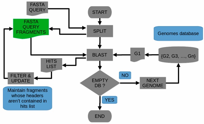 Using a sorted database from the most similar to the most dissimilar genome compared to the genome of interest, using the iterative search with the elimination of fragments that hit a subsequence in the queried genome, increases the computing speed in each iteration. This is because in the first searching procedure, a high proportion of fragments will be eliminated from FASTA file, and the time of execution of the subsequent Blastn searching will be less compared with the previous iteration.