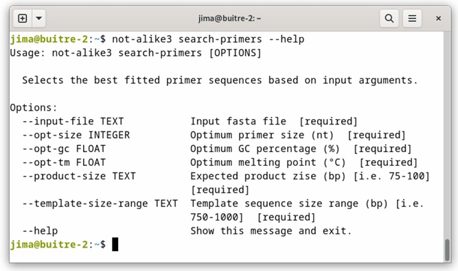 Figure 4 Search-primers command usage information. It shows the required arguments and the description of the command. Figura 4. Información de uso del comando “search-primers”. Muestra los argumentos requeridos y la descripción del comando.
