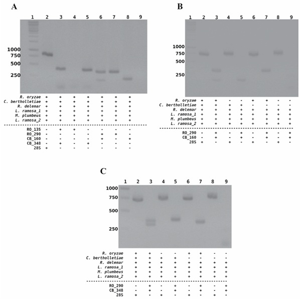 In (Figure 5B) show results from PCR experiments where we prepared 4 different blended, in one sample we mixed the genomic DNA of all Mucorales, in the other three samples we mixed almost all genomic DNAs of all Mucorales, but we excluded R. oryzae or C. bertholletiae or both genomic DNAs, and then we challenged these samples with primers pairs (RO_290 and CB_160). We observed the two expected bands when both genomic DNAs of R. oryzae and C. bertholletia were present in the sample (lane three). Also, we observed the expected band sizes only when the genomic DNA of C. bertholletiae (lane five) or R. oryzae (lane seven) was present in the mixed sample. No band was observed when both genomic DNAs were absent in the sample (lane nine). Lanes two, four, six and eight are controls where we used universal primers (NL1 and NL4) that amplify a region of 28S rRNA gene (approximately 750 bp).