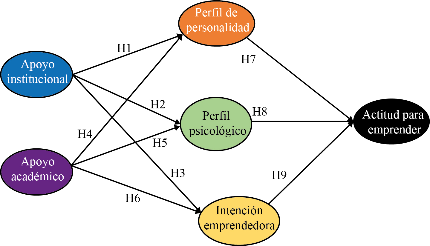 Después de definir las variables que influyen en la actitud emprendedora, se analiza el modelo que muestra la relación entre dichas variables. El modelo teórico propuesto en la Figura 1, muestra las variables de investigación, es decir, los factores que afectan la actitud emprendedora: apoyo institucional, apoyo académico, perfil de personalidad, perfil psicológico e intención emprendedora.