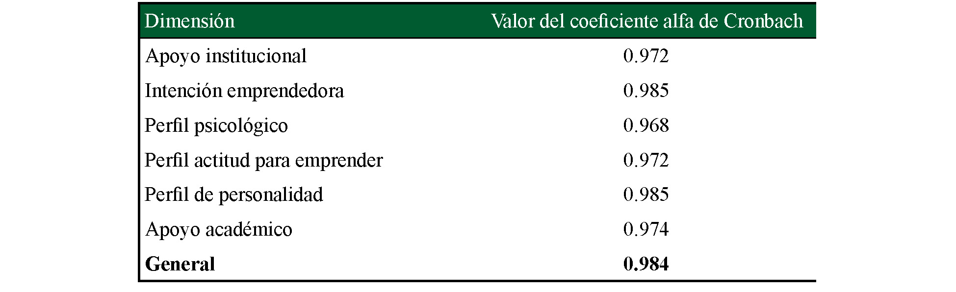 El instrumento fue validado y en cada dimensión se determinó el alfa de Cronbach para calcular la fiabilidad de los datos. Los resultados obtenidos se presentan en el Cuadro 1. Como se observa, el valor del alfa de Cronbach combinado es de 0.984, con ello se asevera que existe un 98.4% de confiabilidad en los datos para poder inferir.