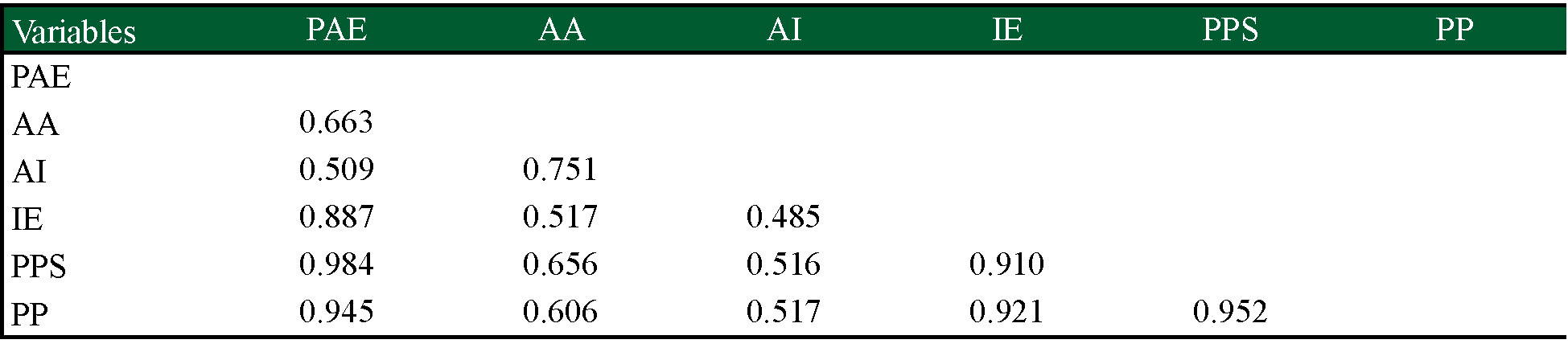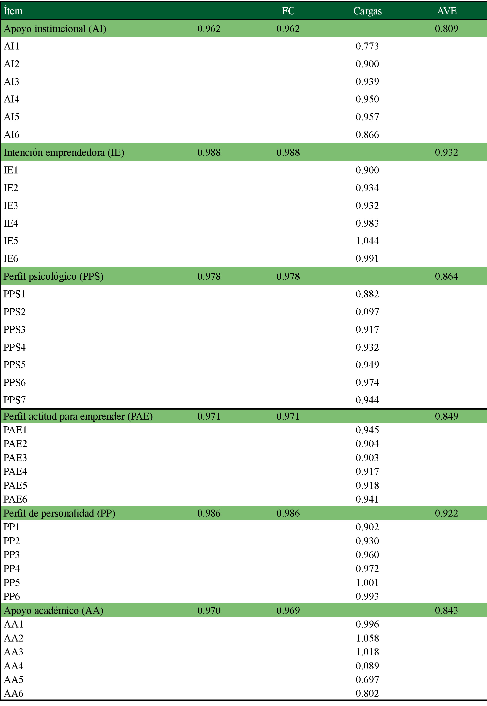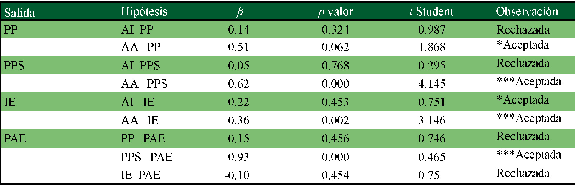 Los resultados de las relaciones hipotéticas entre las variables se muestran en el cuadro 4. Se observa que las relaciones entre los constructos AI PP, AI → PPS, AI → IE, AA → IE, PP → PAE y IE→ PAE son débiles, mientras que las relaciones AA → PP, AA → PPS son moderadas y PPS→ PAE es fuerte.