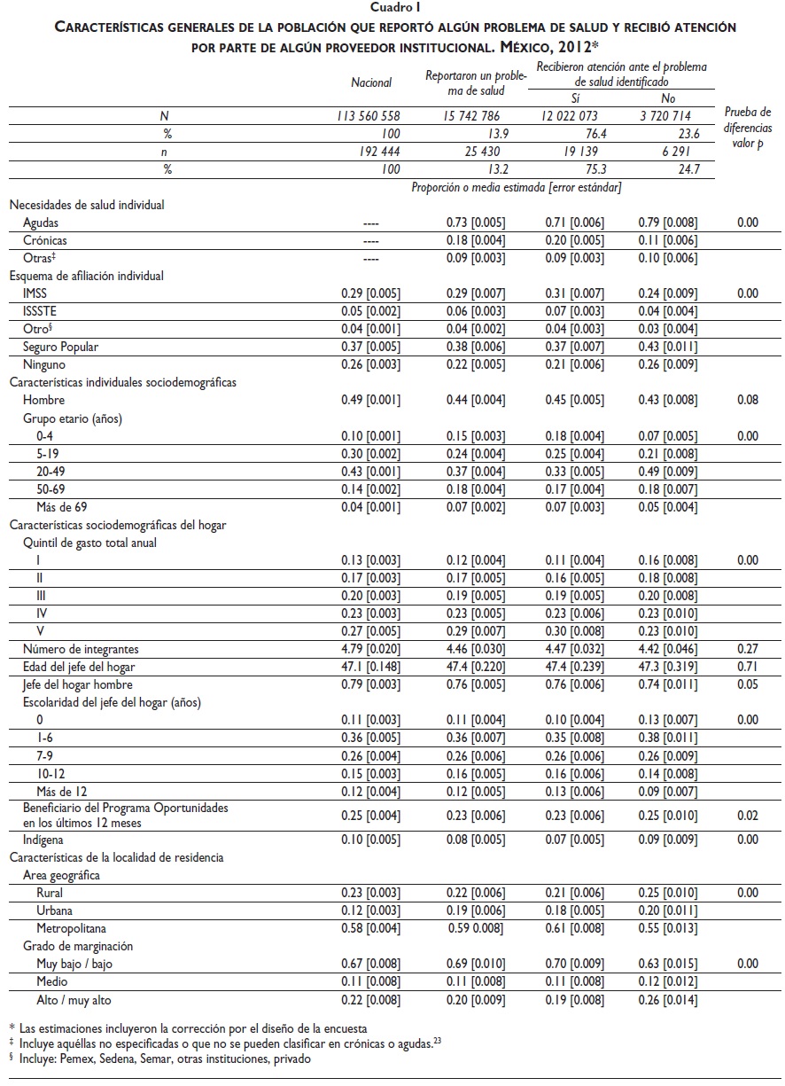 El cuadro I muestra las características generales de la población que reportó algún problema de salud y recibió atención por parte de algún tipo de proveedor de salud. De acuerdo con estos resultados, 13.9% de los mexicanos reportaron un problema de salud en las últimas dos semanas y de ellos, 76.4% recibió atención a su problema. El 73% de la población mexicana que reportó un problema de salud tuvo una necesidad de salud aguda, 18% crónica y 9% de otro tipo. Cerca de 38% de esta población reportó estar afiliada al SP, 36% al IMSS o ISSSTE y 22% reportó no contar con ningún tipo de seguro de salud.