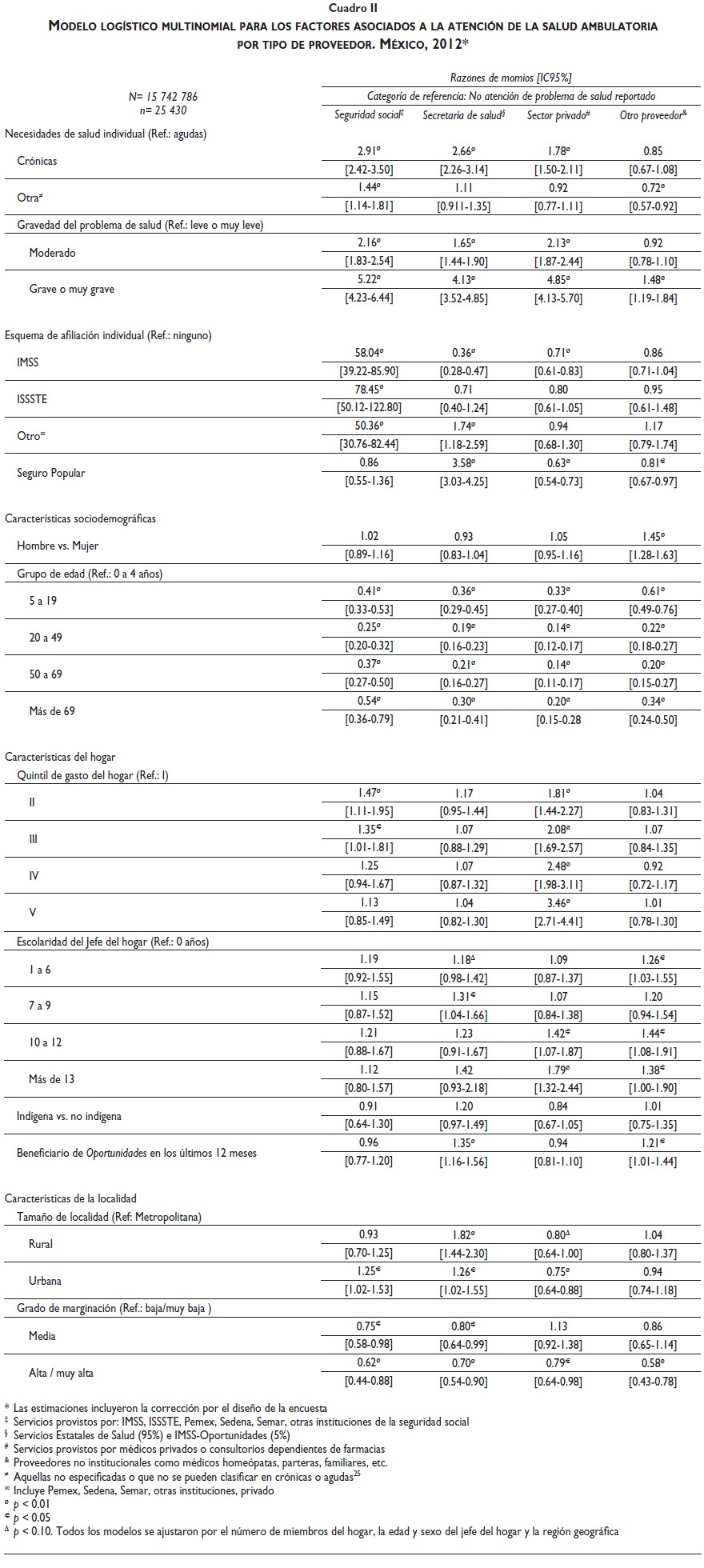 Materials and methods. Using ENSANUT 2012 multinomial regression models were estimated to analyze the use of outpatient services and associated factors.
