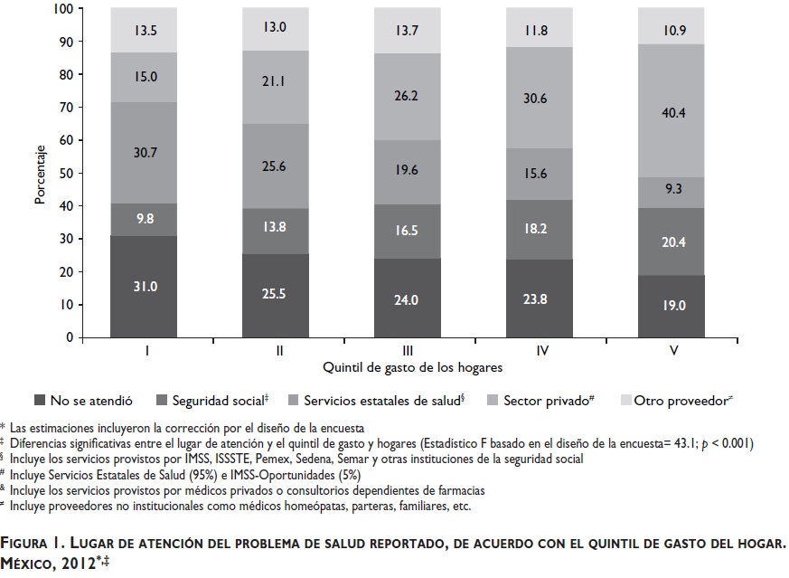 Para continuar en este enfoque analítico, la figura 1 muestra la distribución de los individuos de la encuesta por quintil de GT, y dentro de cada quintil de gasto la distribución de los individuos en términos de haber recibido o no atención, y entre los que recibieron, el lugar en donde fueron atendidos. Como puede observarse en la figura, a medida que crece el GT, el porcentaje de individuos que reportaron no haber usado ningún tipo de servicio (a pesar de haber identificado una necesidad de salud) es mayor entre los más pobres (31%) que entre los menos pobres (19%). Entre los que usaron algún tipo de servicio médico, sólo 9.8% de los más pobres lo hicieron en instituciones de la seguridad social, en contraste con 20.4% de los menos pobres. La tendencia es exactamente la contraria cuando se observa la utilización de los servicios de la SSa: entre los más pobres que usaron algún tipo de servicio, 30.7% acudieron a estos servicios, comparados con tan sólo 9.3% del Q-V. Finalmente, la elección de uso de servicios privados claramente también está ligada al nivel socioeconómico: entre los hogares más pobres, 15% de los que recibieron servicios tuvieron acceso a un proveedor privado en contraste con 40.4% entre los hogares de ingresos más altos.