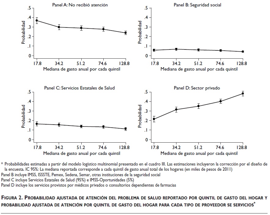 A modo de síntesis del análisis presentado en este trabajo, la figura 2 muestra las probabilidades de atención del problema de salud percibido, ajustadas por quintil de GT, y la probabilidad de atención ajustada, por quintil de GT, para cada tipo de proveedor de servicios. En primer lugar, la probabilidad de no recibir atención ambulatoria cuando se identificó un problema de salud disminuye significativamente conforme aumenta el nivel de gasto (panel A de la figura 2). En claro contraste, entre los individuos que acceden a servicios de atención ambulatoria, la probabilidad de atenderse en el sector privado aumenta significativa y pronunciadamente conforme aumenta el nivel económico de los hogares (panel D de la figura 2). Finalmente, la probabilidad ajustada de acceso a servicios tiene una relación menos significativa cuando la elección es la seguridad social y de la SSa (paneles B y C de la figura 2).