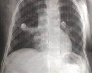 Figura 1: Telerradiografía de tórax: presenta una imagen que incrementa la densidad pulmonar en el lóbulo medio caracterizada por un patrón de consolidación con broncograma aéreo y signo de silueta positivo, sugerentes de una atelectasia pulmonar.