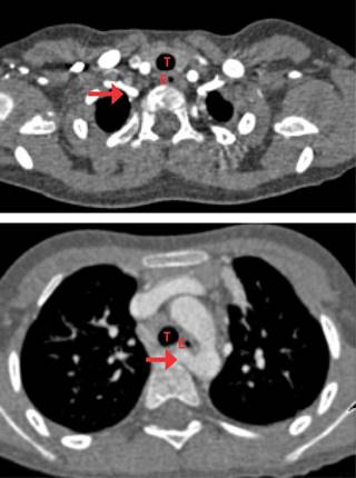 La arteria subclavia derecha aberrante ha sido reconocida y encontrada en 0.4% de las autopsias y se ha asociado con trisomía 21 y otros síndromes genéticos asociados con anomalías del arco aórtico,6 lo que la hace uno de los anillos vasculares menos comunes. Sus signos y síntomas inician en los primeros meses de vida y son característicos: estridor bifásico o espiratorio que aumenta con el llanto y la alimentación, «tos seca», infecciones respiratorias recurrentes, episodios de apnea refleja y cianosis, sibilancias, hiperextensión cervical y retracción esternal e intercostal.7 Por lo común, dichos síntomas son intermitentes, se modifican según posición y pueden incluso confundirse con un asma de difícil control,2 tal y como sucedió en el caso previamente descrito. Cuando resulta comprometida la vía digestiva por compresión del esófago, los síntomas más frecuentes son disfagia, vómitos, desnutrición y dificultad en la alimentación, principalmente con la ingesta de sólidos.8 En cuanto a la sintomatología descrita, la disfagia, que es uno de los síntomas cardinales para el diagnóstico, fue subestimada por los padres hasta que se realizó la evaluación.