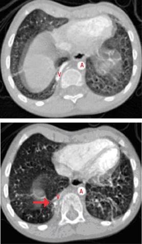 Figura 3: Angiotomografía computarizada de tórax en la cual se observa la presencia de hipervascularidad pulmonar que genera una lesión sólida muy pequeña (flecha) y vaso nutricio (V) que nace de la aorta torácica descendente (A) y se localiza cerca del diafragma, de 4 mm de diámetro que se dirige a la región basal del pulmón derecho.