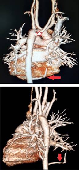 Estudios: difusión de monóxido de carbono (DLCO) 7.5 mL/min/mmHg (valor predicho 10.2), espirometría posbroncodilatador con una respuesta en volumen espiratorio forzado en el primer segundo (FEV1) del 16% y de más de 200 mL. La radiografía de tórax muestra un patrón atelectásico (Figura 1). Serie esofagogastroduodenal (SEGD) con presencia de reflujo grado III; en la angiotomografía de tórax (angio-TC) se observa una subclavia derecha aberrante (Figura 2), lo mismo que en la aorta descendente, también un vaso aberrante (Figuras 3 y 4).
