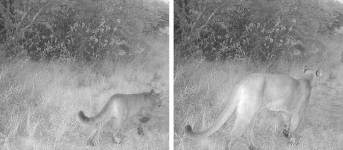 We recorded puma on eight occasions from two localities (Table 2). One record was a track, and seven were photographs taken by trail cameras. Six of the seven “photographs” were taken during the night, while one was taken in the early morning. This morning record was of a 6-7-month-old cub closely followed by an adult (Fig. 7). The cub and adult were separated 11 seconds (7:37:14 and 7:37:25, respectively).