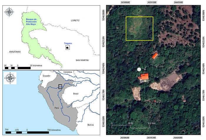La investigación se realizó en el vivero de la Finca Don Pepito en Tingana, provincia y distrito de Moyobamba, departamento San Martín, Perú (05°54'37.8''S, 77°06'52.0''W; altitud 811 m; Fig. 1). La temperatura y precipitación promedio anual son 22.8 °C y 1265 mm, respectivamente (PEAM, 2004). La concesión para la conservación Tingana se encuentra en el VAM, en el piedemonte andino amazónico a una altitud promedio de 880 m.
