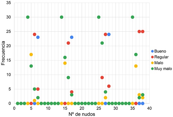 Se observa la incidencia de la implementación de cada tratamiento con respecto al número de nudos por esquejes y la salubridad que estos presentan (Fig. 3). La dispersión de puntos en el plano cartesiano nos permite visualizar el estado de salubridad considerando la frecuencia del tipo de esqueje y su respectivo tratamiento. Observamos que sin importar el tratamiento los esquejes de dos y tres nudos tienen estado de salubridad regular y bueno, mientras que para cero y un nudo es malo y muy malo, respectivamente.