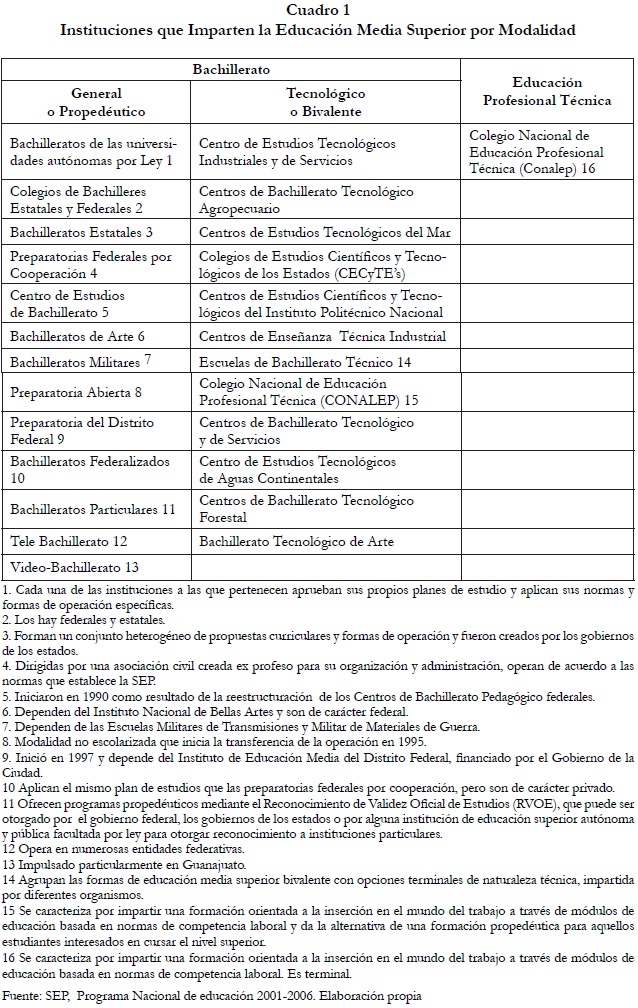 La educación media superior está dividida en dos modalidades (Cuadro 1): el Bachillerato y la Educación Profesional Técnica. El Bachillerato a su vez se divide en General o Propedéutico, el cual prepara a los estudiantes para continuar estudios superiores y es impartido en 13 tipos distintos de instituciones; y en Tecnológico o Bivalente, que prepara al estudiante para continuar estudios superiores y para el desempeño de alguna actividad productiva, y se imparte en 12 tipos de instituciones diferentes. Por su parte, la Educación Profesional Técnica califica al joven en diversas especialidades que lo orientan hacia el mercado de trabajo, y se ofrece en una sola institución.