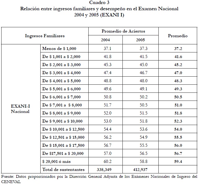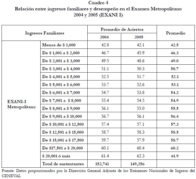 Según datos del Ceneval, existe una relación directa entre los ingresos familiares y el desempeño en el Exani-I, medido por el promedio de aciertos obtenidos. Como muestran los Cuadros 3 y 4, a menor ingreso familiar, menor es el promedio de aciertos obtenido en el examen de ingreso a la educación media superior, tanto a nivel nacional como en el área metropolitana.