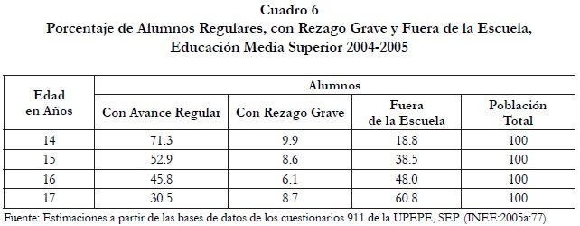 Lo anterior puede explicar que en el rango de edad correspondiente a la Educación Media Superior, el porcentaje de alumnos con avance regular no sea satisfactorio y decrezca dramáticamente con la edad, como lo muestra el Cuadro 6; que los índices de rezago grave se mantengan en todo el rango de edad considerado para el nivel, y que su porcentaje de alumnos que queda fuera de la escuela aumente de manera muy importante conforme pasan los años entre las edades de 14 a 171.