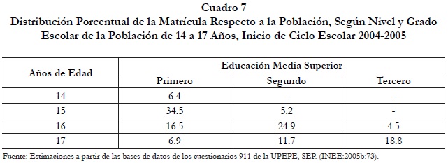 De la misma manera, la matrícula de educación media superior por edad y año escolar, nos indica que son muy pocos los jóvenes que completan ese nivel escolar. Si a los 15 años hay tan sólo un 34.5% de jóvenes en primer año del nivel medio superior, a los 17 ya nomás queda un 18.8% (Cuadro 7). Además, el subsistema de educación media superior está poco diversificado, sólo al completar los tres años que tiene el nivel, se puede obtener un diploma para el mercado de trabajo, y tampoco existen como tales las segundas oportunidades, lo que dificulta que un joven que lo haya abandonado, vuelva a ingresar a él. Es por eso que en México, quien abandona la educación media superior, difícilmente regresa a ella.