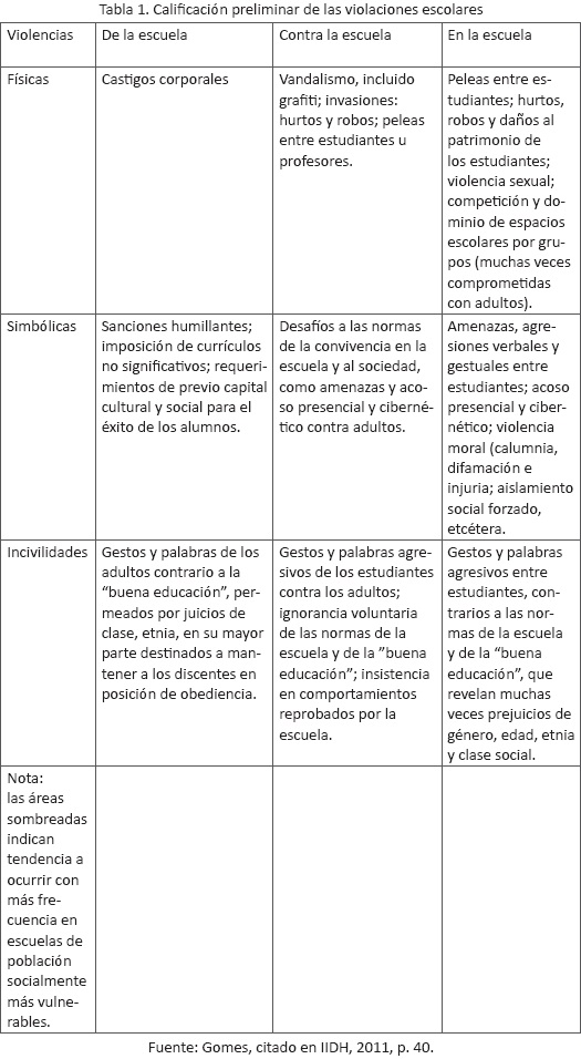 Esta diversidad se manifiesta igualmente a nivel escolar. El especialista brasileño Candido Gomes propone una matriz para clasificar las violencias escolares, la cual integra los aportes de dos categorías de clasificación: una que prevé la relación que tienen los diferentes hechos violentos con la escuela en sí como institución; otra que considera su tipo y grado de severidad. Respecto a la relación con la escuela, se distingue entre violencia de o desde la escuela (la violencia institucional que ejerce la propia escuela o el sistema educativo contra algunos de sus actores); violencia hacia o contra la escuela (aquellos actos que tienen a la escuela como destinataria, es decir, que están dirigidos a destruir o dañar la infraestructura y la legitimidad de la institución); y violencia en la escuela (la reproducción al interior de la escuela de actos delictivos que, en general, ocurren por igual fuera de ella, en la sociedad). En cuanto al tipo y grado de severidad, se distinguen cinco manifestaciones de violencia relevantes: vandalismo (contra las pertenencias de la escuela); disruptividad (contra las actividades/rutinas escolares); indisciplina (contra las normas); violencia interpersonal (entre estudiantes, docentes, etcétera); y criminalidad (actos tipificados como delitos que tienen consecuencias penales) (Gomes, en IIDH, 2011, p. 38).